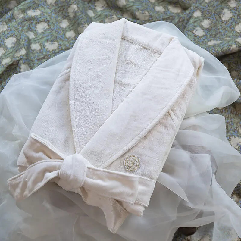 タオル地のやさしさはそのままに。重たくなりがちな素材の表面を丁寧にカットし、ベロアのようになめらかな風合いに仕上げました。ふわっと軽く、肌にすっとなじむ心地よさをお楽しみいただけます。