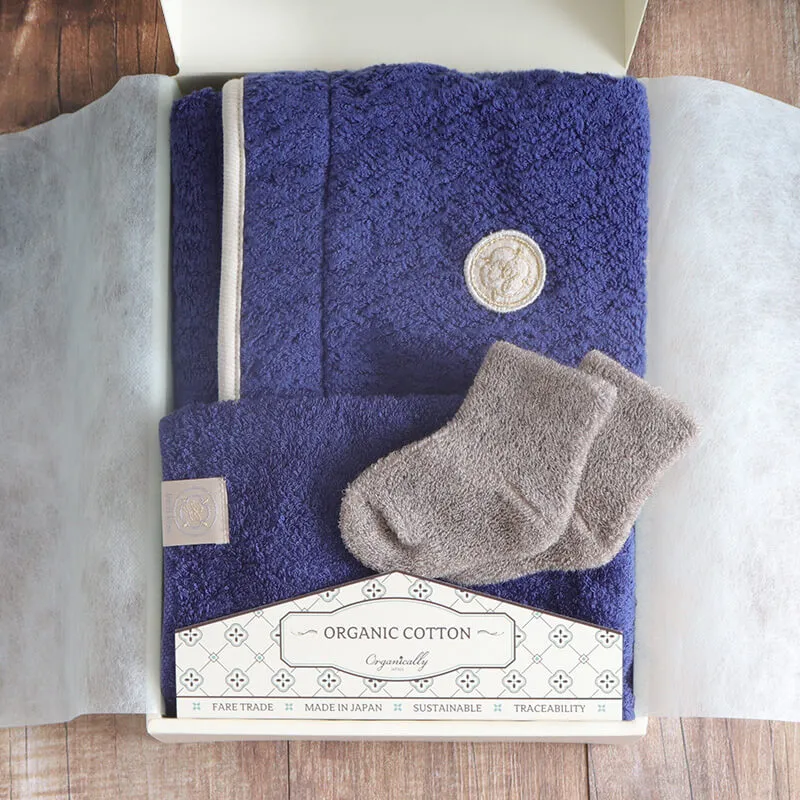落ち着いたネイビーバスローブとハンドタオル靴下のギフトセット